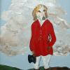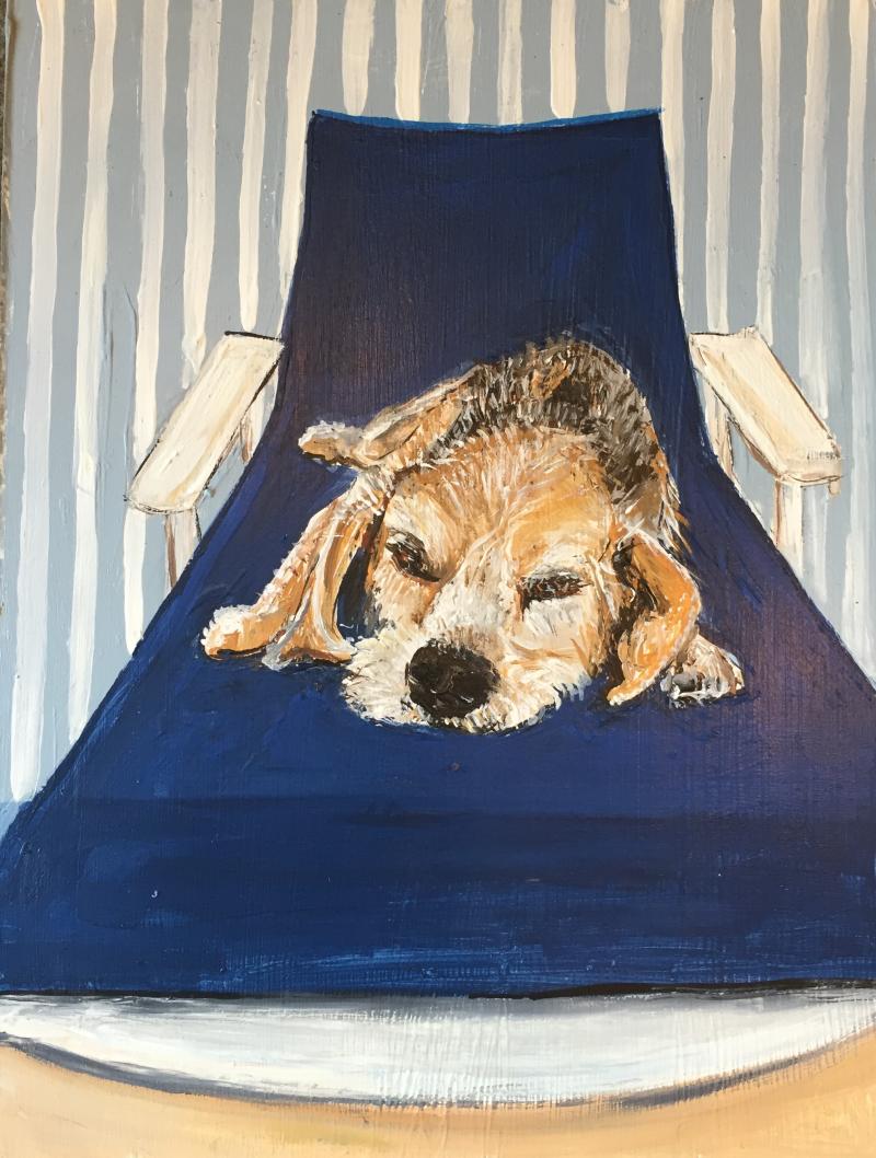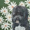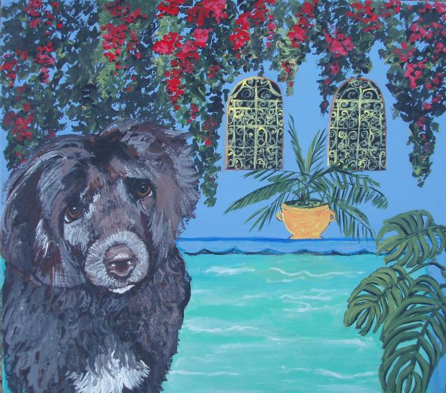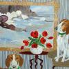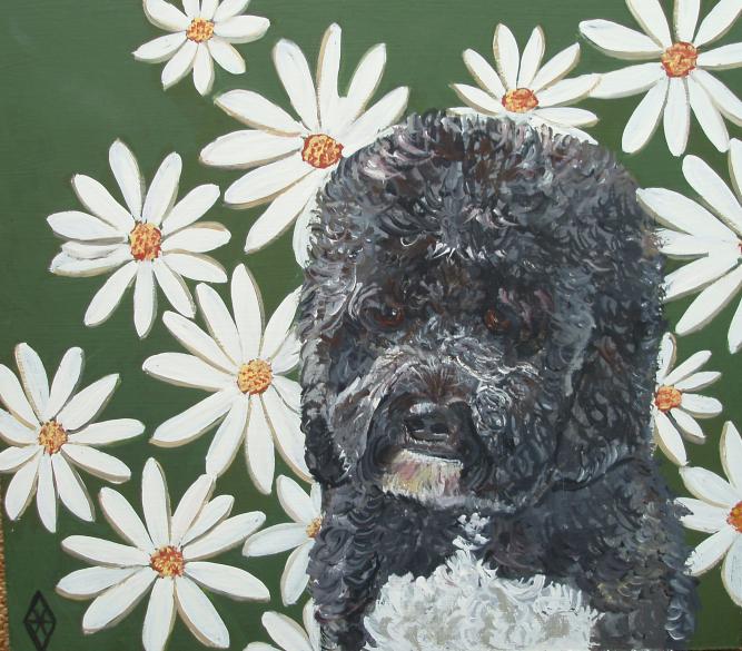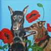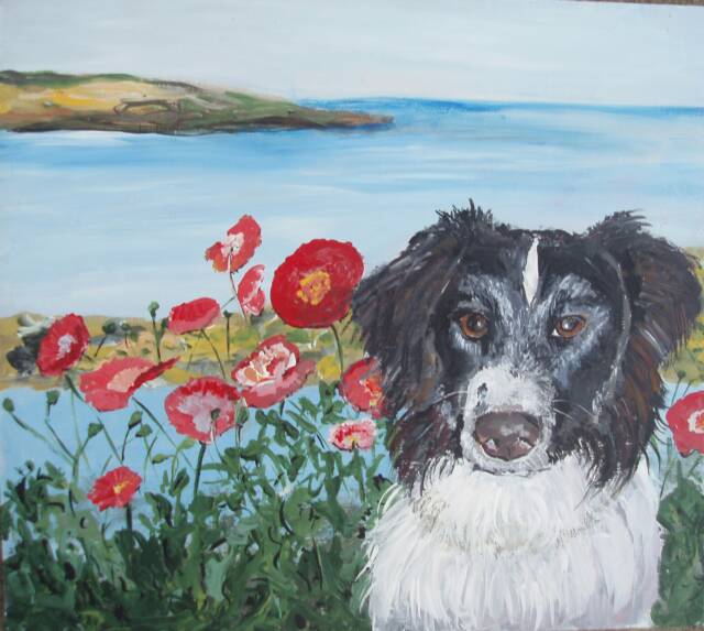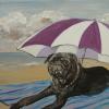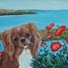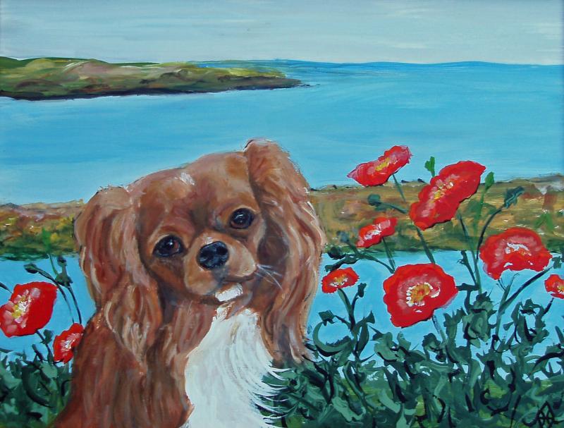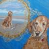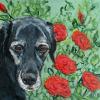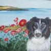 Labradoodle_painting_Judy Henn_dog on beach painting_Poppies_original dog art