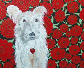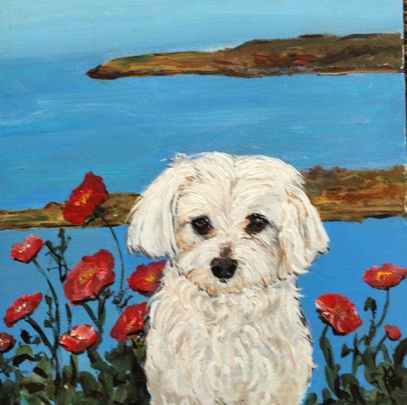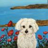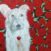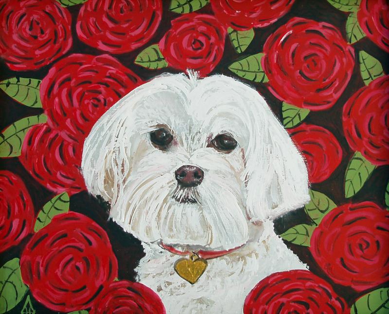 Maltese,dog portrait,painting,Judy Henn,Lambertville NJ,custom,pet portrait,Robins Egg Gallery,roses,gifts