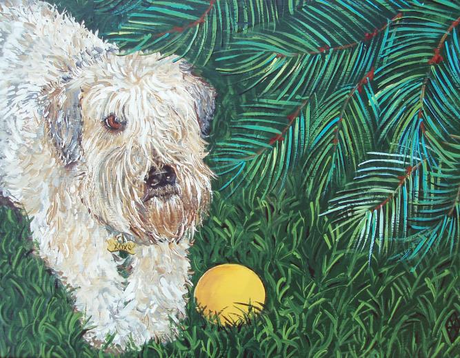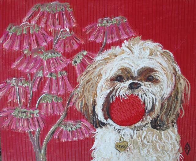 Shih Tzu_painting_red ball_Judy Henn_whimsical dog portrait_Lambertville Gallery
