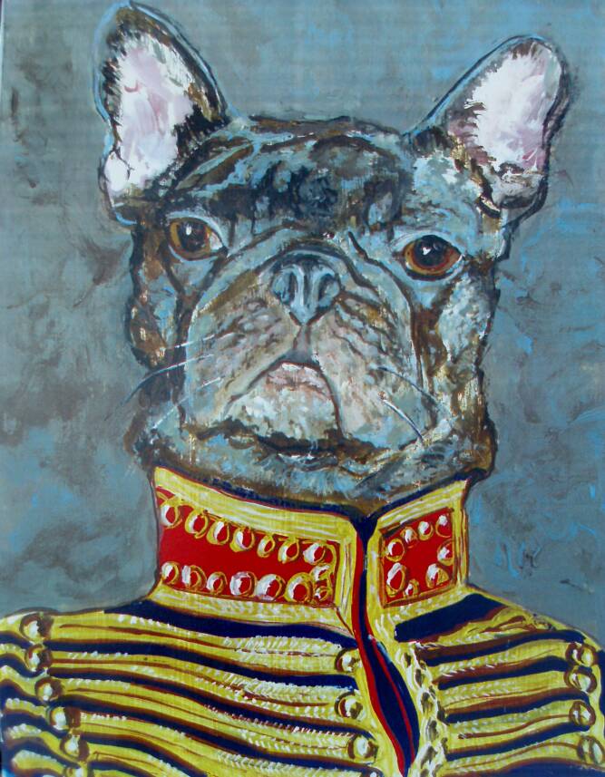 Frenchie,Union Jack,Louis Vuitton,French Bull dog painting,Judy Henn,dog art ,original dog painting